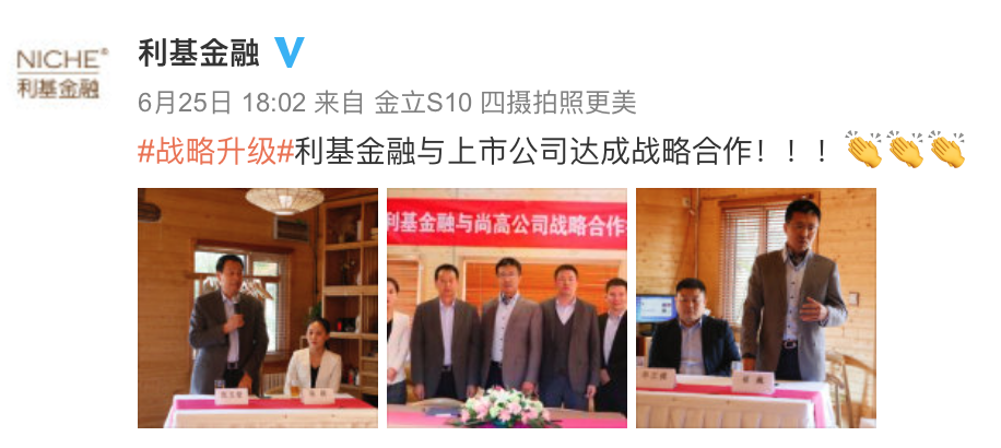 6月25日,利基金融官方微博发布信息称,平台与上市公司达成战略合作。官网曾于4月发布相关信息,合作的上市公司尚高公司是在纳斯达克上市的医药企业。