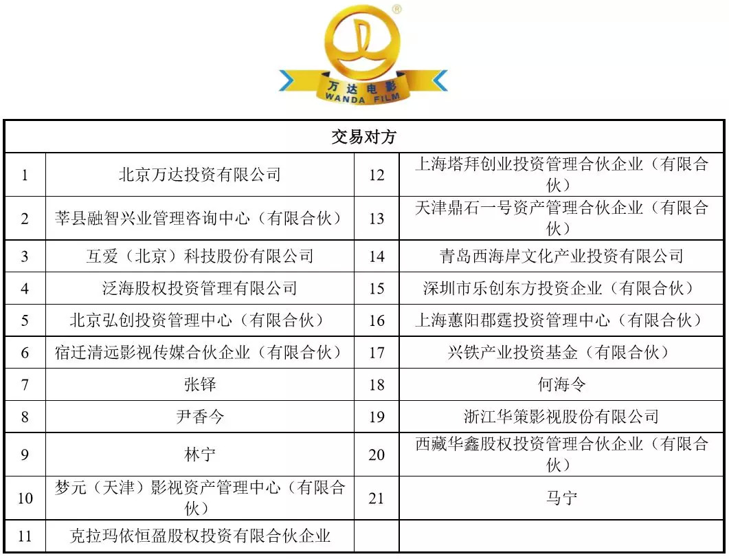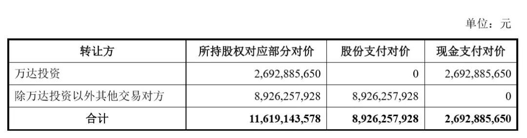 万达电影在公告中表示,万达投资所持标的资产对价26.93亿元,由万达电影以现金方式支付;其他方所持标的资产对价以非公开发行股份的方式支付。