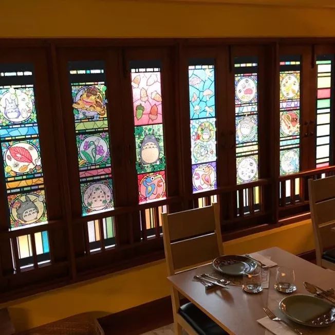 整个餐厅内到处都是龙猫的影子:绿色的草坪上、泳池边、展示柜、餐桌上……就连用餐的窗户也都用了龙猫的彩色玻璃。