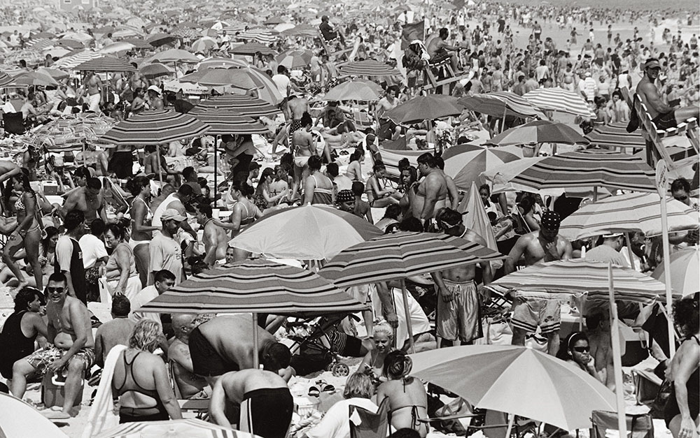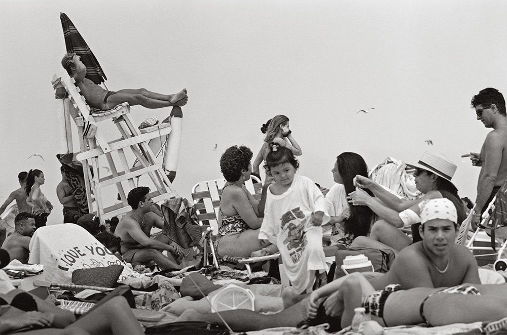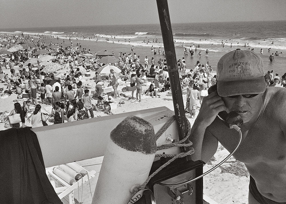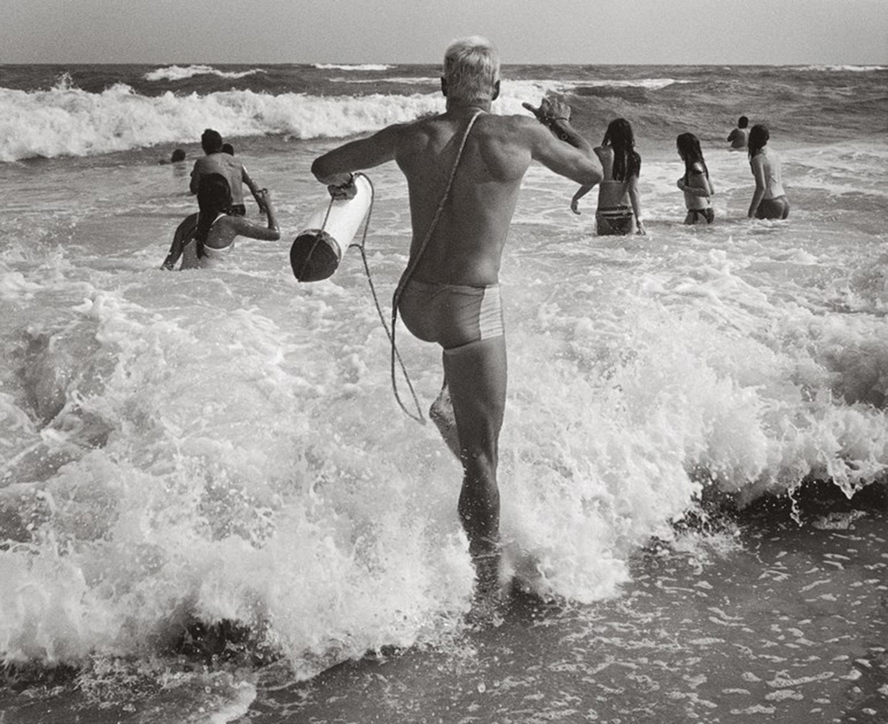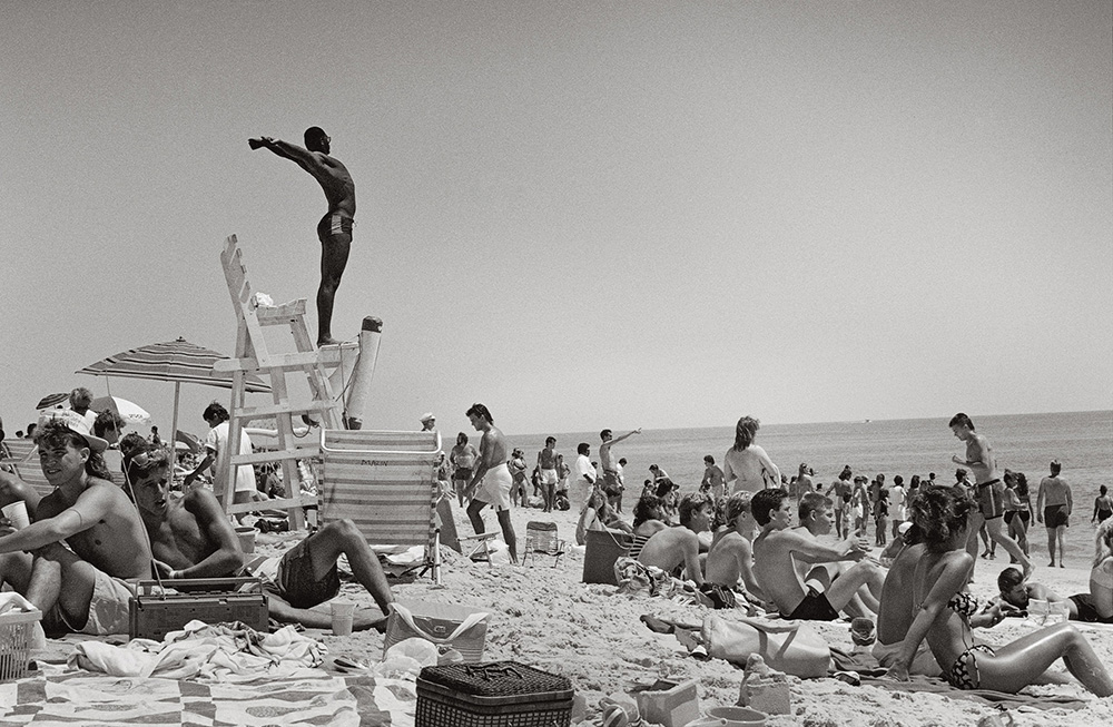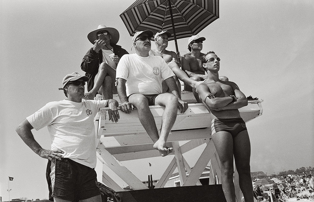 “骨干救生员会一年又一年地回归沙滩,正如燕子之于卡皮斯特拉诺教堂,(美国修道院,初建于1775年,最初为西班牙殖民者向原住民传教的场所,多年以来有大群燕子往返于数千英里以外的阿根廷以及此地之间的奇景——译注)”,在纽约的琼斯沙滩上做了二十多年救生员的格雷格·唐纳德森(Greg Donaldson)在发表于《纽约时报》的一篇文章中如此写道。这一点对摄影师约瑟夫·萨博(Joseph Szabo)来说也成立。作为一个美国青年生活的热心记录者,萨博从1960年代开始就在琼斯沙滩上进行各种拍摄,一年又一年地捕捉着每个夏天来到沙滩上形形色色的人群:不断变化的泳衣样式,近乎全裸的身体,数不清的风格,以及沙滩上充满喜悦与亲密气息的一天。在萨博拍摄的诸多场景里,浮在这一切之上的则是救生员的形象,坐在高脚凳上,全身挺直且高度警惕,与底下的遮阳伞和慵懒的人群形成鲜明对比。有时,他们会被视为是景观里理所当然的组成部分,坐在高脚凳上视野广阔,可以俯瞰人群;有时他们就如同神明一般,端坐在大家头顶的“宝座”上。