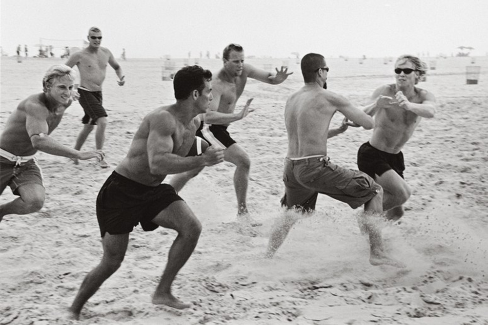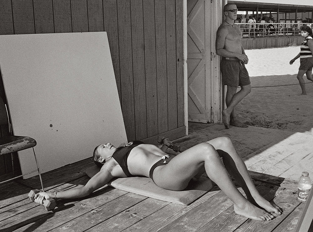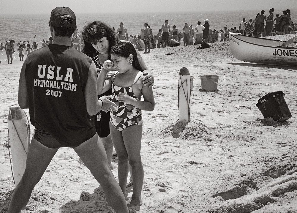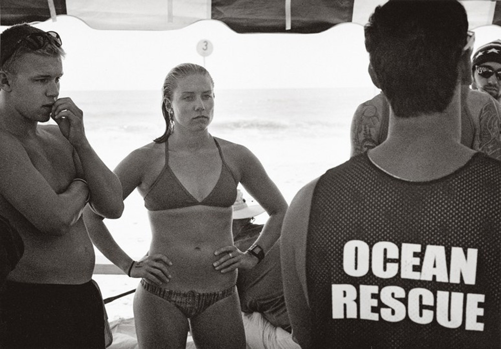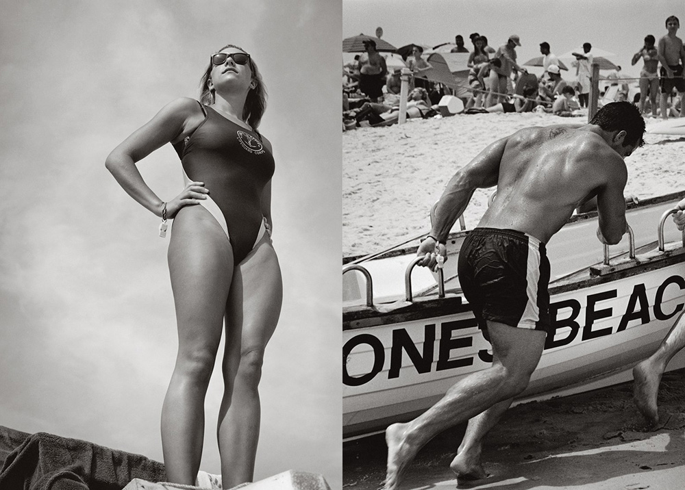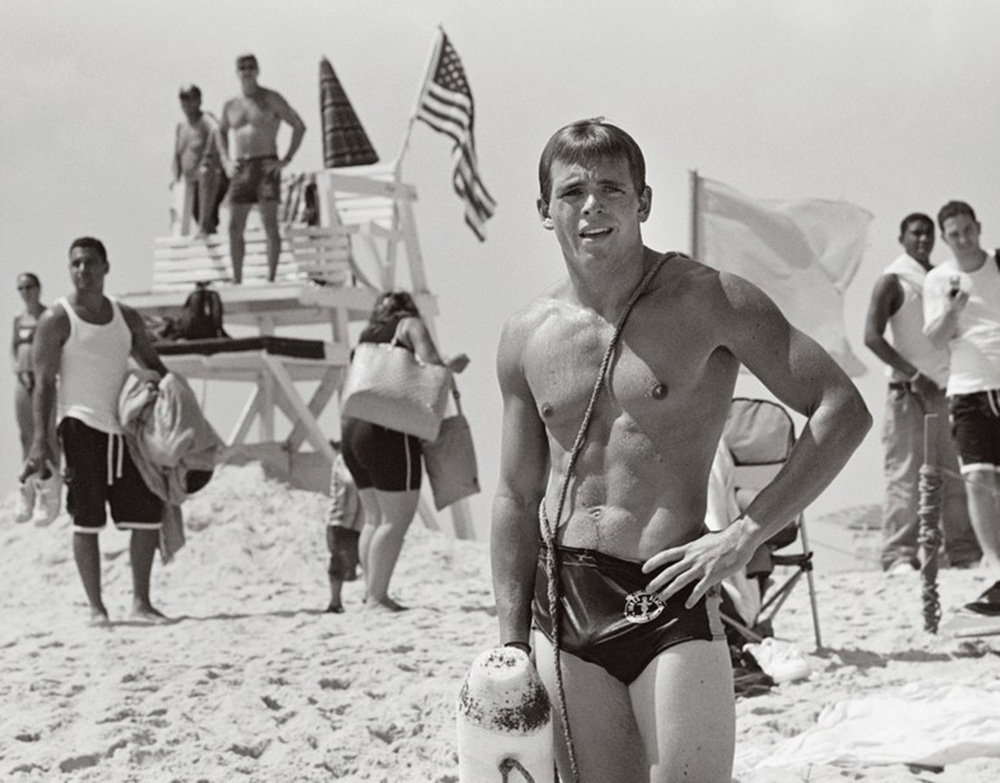 在琼斯沙滩上做救生员的体验跟在地方的游泳池做救生员截然不同。沙滩在长岛岸边前前后后延伸了6.5英里;据公园管理部门统计,此地每年接待的游客达到了600万人次,一到大热天更是会被挤爆,人与人几乎达到摩肩接踵的程度。在“救生员”系列照片集里,萨博记录下了救生员工作对身体素质的极高要求——饱经日光炙烤的皮肤以及闪耀着的一块块肌肉,表现出严酷训练所带来的健美体魄。照片中也带有一种无尽夏日的感觉,某种意义上也包括无尽的青春。这些照片虽然横跨三十年,但它们却有着一种永恒的品质。健美的身体和被海风吹乱了的头发等意象毕竟不拘泥于某个特定的时代。