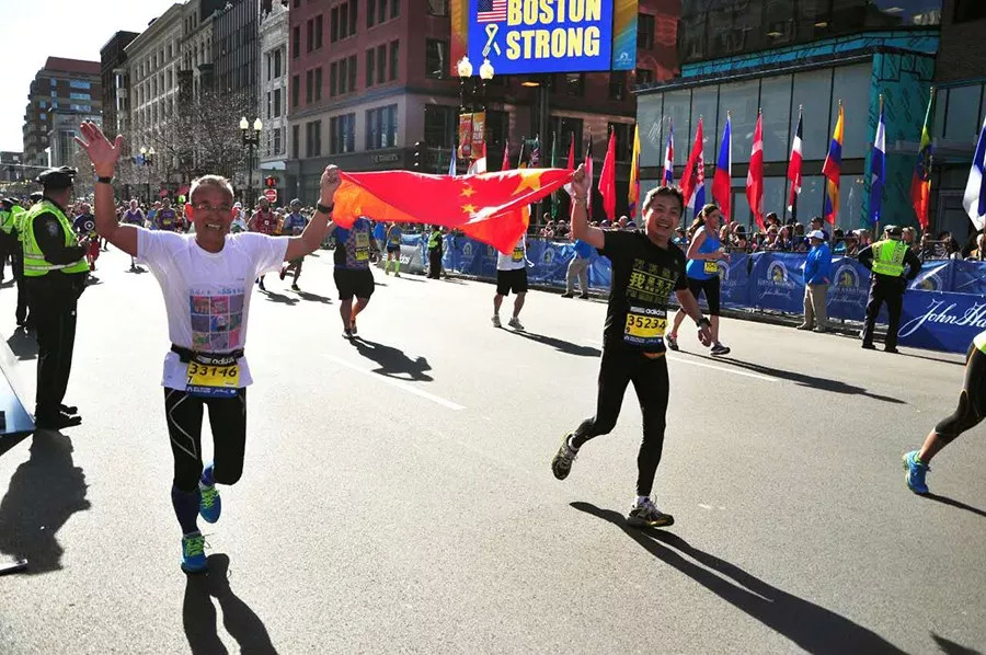 ▲田同生在波士顿马拉松赛道上举起五星红旗▲