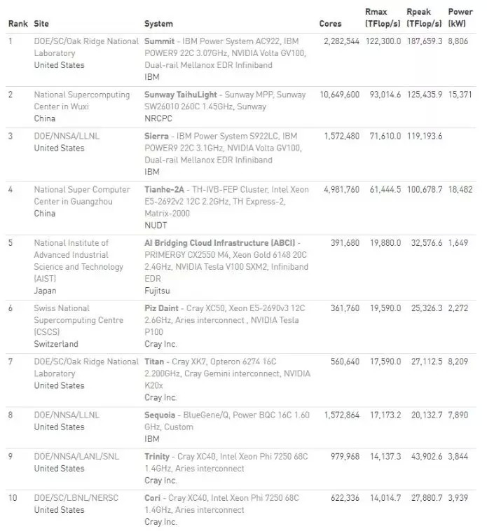 排名第二的是中国的神威·太湖之光,由国家并行计算机工程技术研究中心(NRCPC)开发,安装在国家超级计算无锡中心。该系统在过去两年里一直名列榜首,自2016年6月上线以来,它的HPL成绩一直保持不变,为93 petaflops。神威·太湖之光在Linpack性能测试中的计算效率达到74.2%,达到93 petaflops的性能的功耗为15.37百万瓦(megawatts),而Summit系统达到122.3 petaflops性能的功耗仅8.81百万瓦。