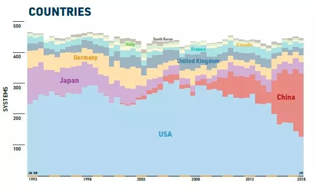 尽管美国在榜单上的排名靠前,但目前美国在榜单上的系统只有124套,创历史新低。就在6个月前,美国在榜单上的系统还有145套。与此同时,中国进入榜单的系统达到206套,占比41%,6个月前是202套。接着是日本,有36套系统,英国22套,德国21套,法国18套。这些数字与上次的榜单基本相同。