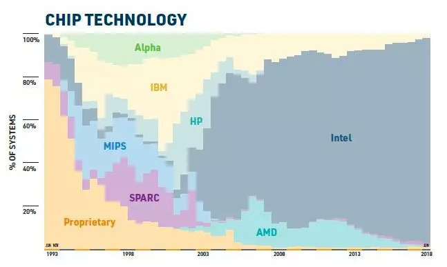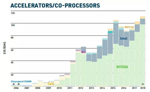 在加速器方面,TOP500系统中有110个使用加速器,相比2017年11月时的101个加速系统略有增加。TOP500超算的总体性能有一半来自某种形式的加速系统。这些使用加速器的系统中有96个使用NVIDIA GPU,其中前10名就有5个:Summit,Sierra,ABCI,Piz Daint和Titan。此外,使用加速器的系统中有7个配备了Xeon Phi协处理器,而PEZY加速器被用在4个系统中。另外20个系统使用Xeon Phi作为主处理器。