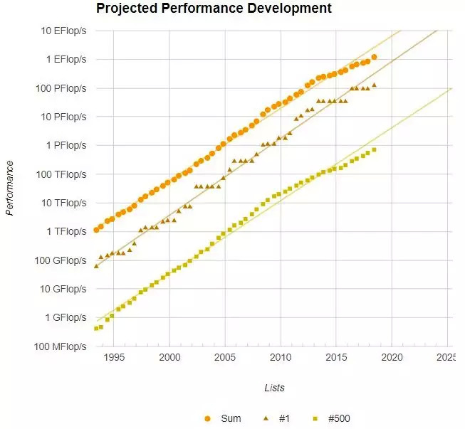 自1993年以来,TOP500的总性能、排名第一以及排名500的超算性能变化如下图所示: