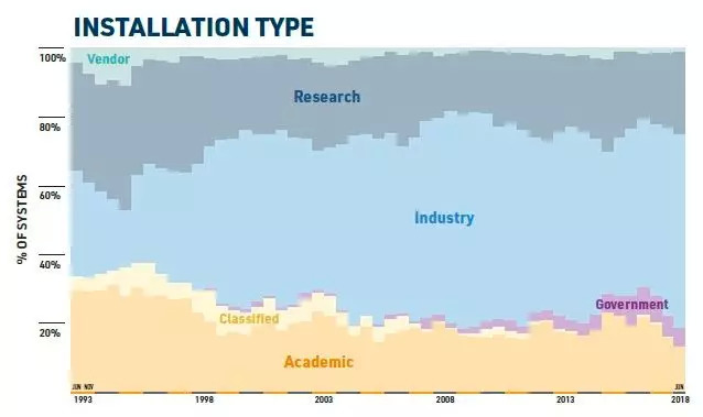 另一个变化是,榜单中学术、机密和研究类型的超算有所减少,而用于工业的超算比例增加了: