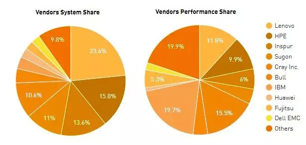 尽管IBM拥有前三名超级计算机中的两款:Summit和Sierra,但它在整个榜单中只有19套系统。然而,由于这两台机器,IBM贡献了TOP500总性能的19.9%。接着是Cray,性能份额为16.5%,联想为12.0%,HPE为9.9%。