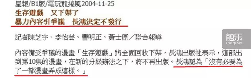 风波越来越大,一地鸡毛的混乱之中,漫画《生存游戏》先是在台湾地区停售,其后引进这部漫画的长鸿出版社迫于压力,决定将已出版到第10卷的漫画全部回收下架,往后不再出版。因销量不佳而被腰斩的漫画常有,但《生存游戏》却是因为造成社会热议而被出版社忍痛腰斩的,实属罕见。