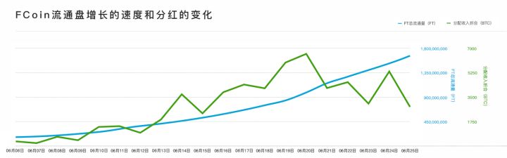 以真实数据来看,在 FT 火爆之初的 6 月 9 日 239,917,202 FT(蓝色线),分红总量折算成 419 BTC(绿色线),而在一周后的 15 号,总流通量为 527,126,662 FT,分红 2338 BTC,当周的日利率高达 3-6% 区间。而随着 FT 价格持续推高,新增手续费的分红速度会渐渐弱于流通盘增长速度,收益率下降。