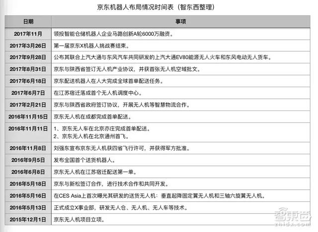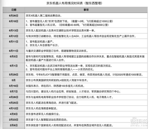 智东西梳理了京东机器人布局的时间表发现,京东在机器人布局上主要有自研、投资、合作三大路径。从频繁的产品迭代、宣传、以及京东物流所说的未来将不局限于将机器人用于自家物流,可以看出,在整个京东物流体系里,机器人已经成为了核心角色。