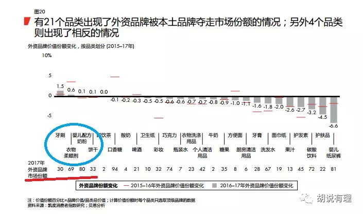 在婴幼儿纸尿裤、瓶装水等21个品类中,本土品牌从外资品牌手中赢得市场份额,而外资品牌在4个品类获胜,分别是婴幼儿奶粉、牙刷、衣物柔顺剂、饼干。即饮茶是唯一一个本土外资品牌份额保持不变的品类。