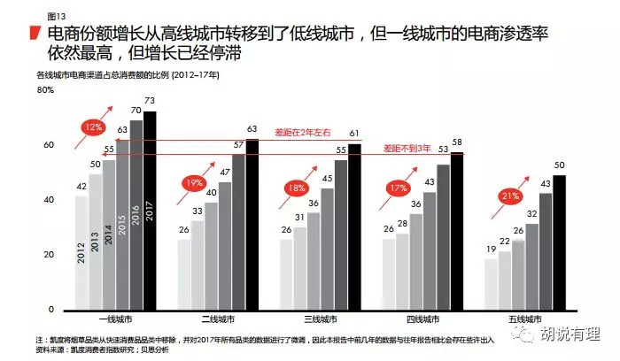 另外,电商渠道渗透率增长引擎正从高层级向低层级城市转移。一线城市中,电商渠道渗透率为73%,依然排名第一,但增长已经停滞。低层级城市则在迎头赶上:三线和四线城市的电商渠道渗透率年增速分别达到18%和17%,而五线城市的电商渠道渗透率年增速甚至达到了21%。
