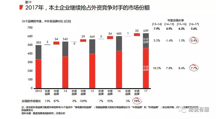 值得注意的是,报告中揭示每年的研究中都观察到这样的现象:本土企业抢占了外资品牌的市场份额。2017年,本土品牌实现了7.7%的增长,贡献了中国快速消费品市场98%的增长额。与之相比,外资品牌仅仅增长0.4%。