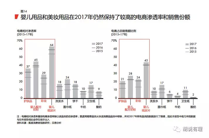 报告显示,2017年婴儿用品和美妆用仍然保持较高的电商渗透率和销售份额。如电商销售婴儿奶粉销售额占比达到28%;婴儿纸尿片占比更是高达45%。