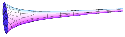 17世纪的几何悖论。意大利数学家托里拆利(Evangelista Torricelli)将y=1/x中x≥1的部分绕着x轴旋转了一圈,得到了上面的小号状图形(注:上图只显示了一部分图形)。然后他得出:这个小号的表面积无穷大,可体积却是 π。