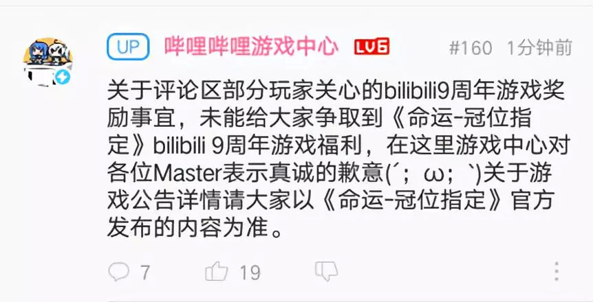 B站已经预见到了粉丝的怒火,当晚进行了关服维护,并在第二天发放了维护补偿。由于B站只拥有运营权,在不影响游戏平衡的条件下,对于福利发放的权力有限,依靠维护发放福利的形式粉丝已经默许。然而,B站又发来了无关痛痒的道歉声明,还是B站游戏中心,楼中楼的形式。