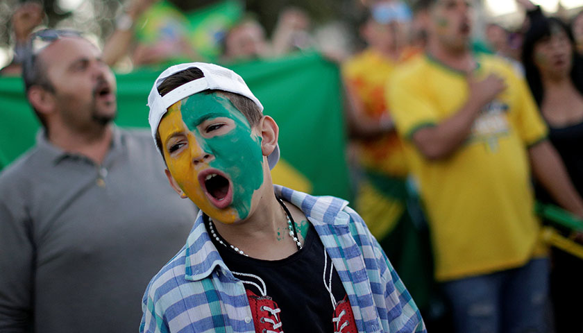 作为足球王国,巴西的选战也少不了足球的影子。在2015年右派支持者抗议罗塞夫的游行活动中,示威者们出其不意地选择了巴西队的经典黄蓝色球衣作为统一服装,这让左翼和中间派选民大为光火。