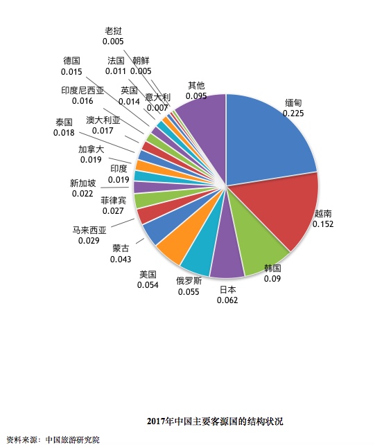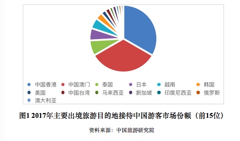 2017年中国游客出境目的地前15位分别为中国香港、中国澳门、泰国、日本、越南、韩国、美国、中国台湾、马来西亚、新加坡、印度尼西亚、俄罗斯和澳大利亚。出国游的比例占出境游总数同比提升。