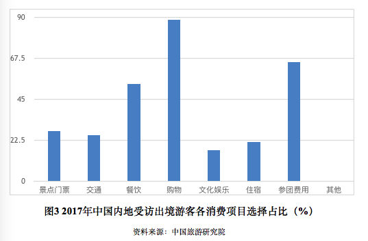 2018年中国出境游花费为1152.9亿美元,同比增长5.0%。报告显示,出境游客对于体验当地人生活方式的需求增长,例如美食、自然探险、户外运动、避寒避暑、深度体验、疗休养等旅行主题受到欢迎。自由行的旅游需求增长,团队游客对目的地的弹性时间安排要求增强。购物在旅游花费中的比重仍然最高,但比重收缩,购物内容向日常用品变化。