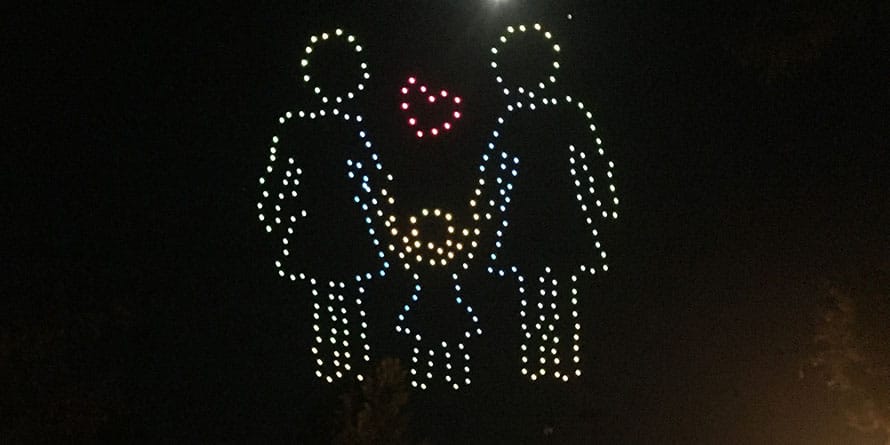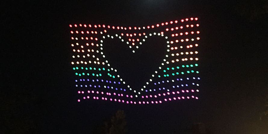 英特尔出动了300架无人机上演了一场灯光秀。6月23号,美国加州Folsom的英特尔园区举行了庆祝活动——发光的无人机组成象征LGBTQ的彩虹旗、独角兽还有同性家庭的图案照亮了夜空。