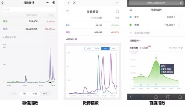 从百度指数、微博指数、微信指数的近30天趋势来看,蒙牛和梅西的两次爆发点都在阿根廷的两次输球时间上,梅西的热度在世界杯期间一直是稳步上升,反观蒙牛的指数上升并没有梅西那么强烈。