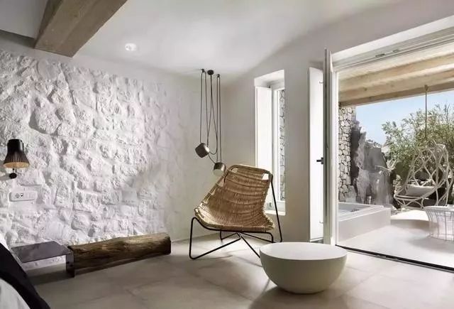 但你千万别被它神秘莫测的外表所唬住,走进房间,会发现一切豁然开朗。整个房间以米色和灰色的主色调,慵懒的吊床、轻松的沙发、舒适的露台以及小型泳池,传统的希腊风情尽在眼前,在阳光下酌饮一杯葡萄酒,整个世界仿佛都被抛在脑后。
