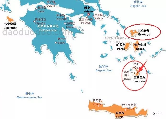 ↑ 图为圣托里尼与米科诺斯岛的位置关系(图片来源于岛多多网站)