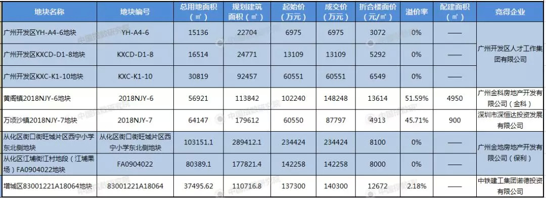 昨天下午3时,广州市土地市场放量公开拍卖了8宗宅地(花都区凤凰路地块、增城石滩镇地块延拍),具体包括黄埔3宗(全自持纯租赁用地)、南沙2宗、从化2宗、增城1宗,分别位于黄埔科学城和长岭居、增城荔城、南沙黄阁镇和万顷沙、从化街口街和江埔,成交原则则分别采取“限地价+摇号”、“限地价+竞自持商品房面积/年限+摇号”、“限地价+竞配建人才公寓+竞自持商品房面积+摇号”和“限地价+竞自持商品房面积+摇号”的方式确定竞得人。最终,广州开发区人才工作集团有限公司以8.06亿元底价竞得黄浦区3宗地,金科和深圳市深恒达投资发展有限公司则分别以14.82亿元、 8.78亿元竞得南沙区黄阁镇2018NJY-6地块和南沙区万顷沙镇2018NJY-7地块,广州金地房地产开发有限公司(保利) 以37.67亿元底价摘得从化2宗地块,增城区83001221A18064地块则由中铁建工集团诺德投资有限公司以14.03亿元摘得,折合楼面价12672元/㎡。