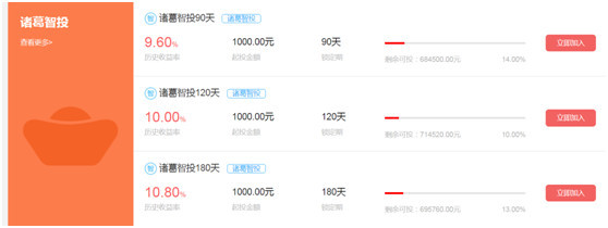 小诸葛官网显示,截至目前为止,累计用户161.8万人,累计成交额8.94亿元,而新手标专项收益率高达14%,期限为30天,2天的体验专项标历史收益率也高达8%。整体来看,小诸葛的理财产品收益率均在9%以上,在目前资产荒以及资金流动趋紧的背景,如此高的收益,平台风险也相对较大。