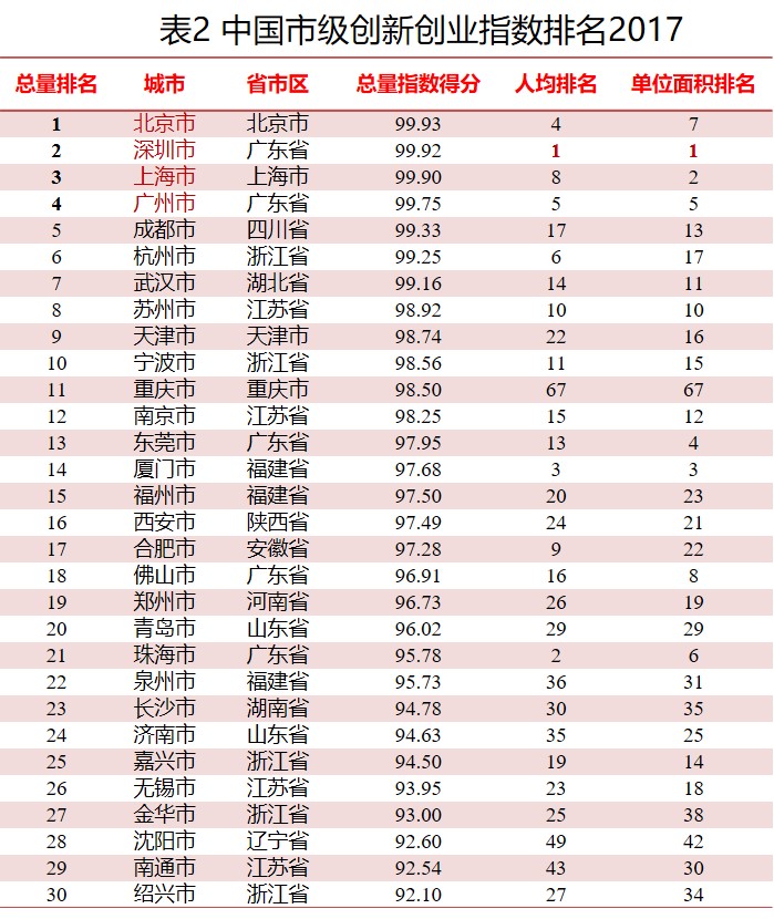 从市级比较来看,在总量指数排名中,“北上广深”排名靠前,成为当前最具创新创业活力的四大热点城市;人均和单位面积排名,深圳排名位居榜首,起到创新创业密度上的“领头羊”作用。