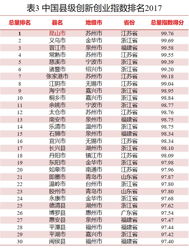 在总量指数“百强县”排名中,江苏昆山位居第一,成为县域创新创业的“风向标”;紧随其后,排名前十的是浙江义乌、福建晋江、江苏常熟、浙江慈溪、浙江诸暨、江苏张家港、江苏江阴、浙江海宁和浙江桐乡等。其中,“江浙”地区拥有百强县前十名单中9个席位。