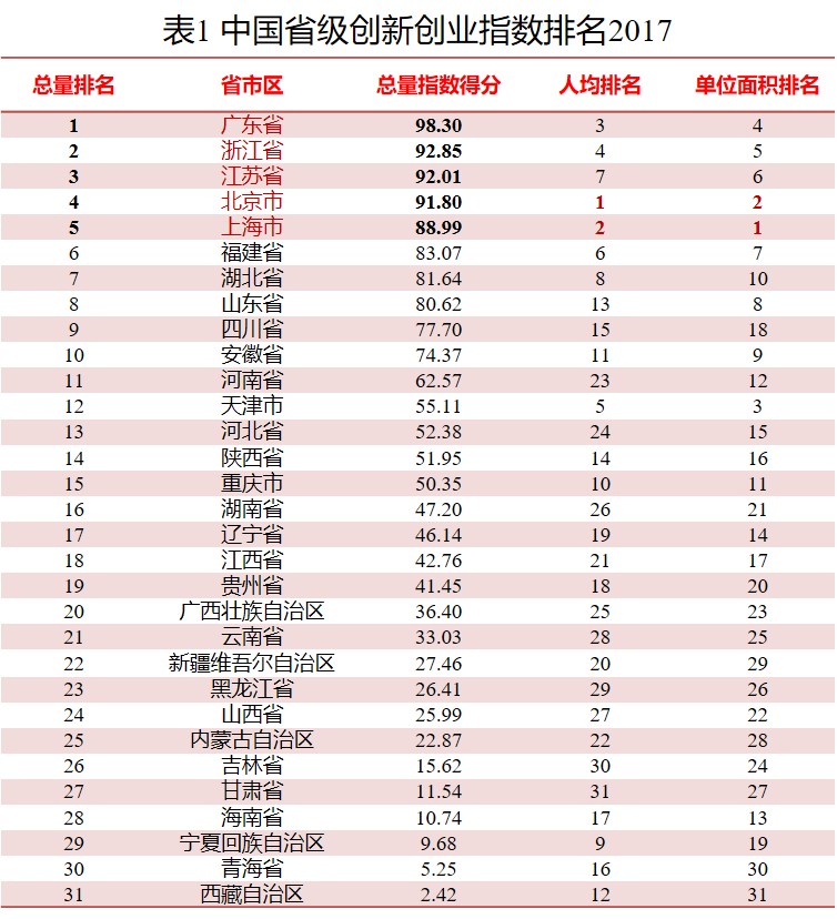 2017年,从省级比较来看,省级排名总量指数得分排名显示,前五位的依次是:广东、浙江、江苏、北京和上海,是创新创业“第一梯队”,均来自于当今中国经济发展最活跃的三大经济圈。