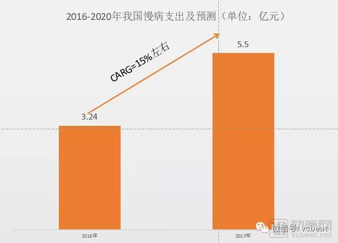 其中慢病支出占卫生总费用的70%左右,2016年约为32441.5亿元。如果未来能够将其中10%转化为慢病管理费用,则市场规模将有3244亿元,发展潜力巨大。
