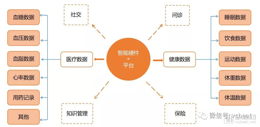 从上图中,我们认为利用互联网技术切入慢病领域的企业的主要方向在于数据监测、慢病提醒和药械,包括智能硬件、健康云、大数据、在线问诊、患者社群、远程医疗、挂号导诊、医药电商等诸多互联网模式,成为互联网企业与线下的医疗机构及健康管理机构形成综合管理体系的最佳领域。