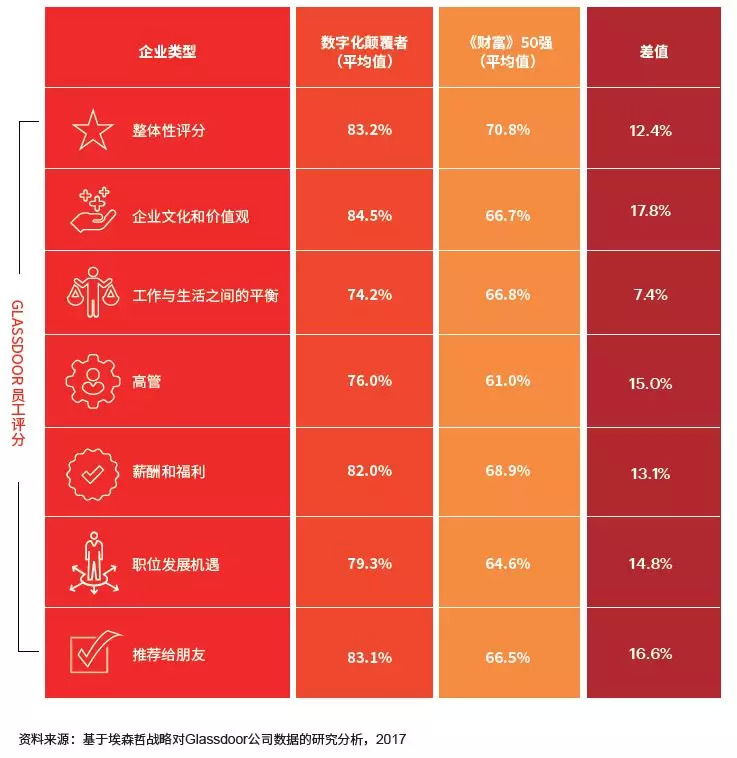 事实上,其结果不无道理可循。首先,以云、社交、分析和移动技术为代表的新时代弄潮儿,数字化颠覆者(数字化原生企业)往往比传统企业更擅长与生态系统内的伙伴合作,吸引所需人才;其次,埃森哲战略对招聘网站Glassdoor分析后发现,员工对数字化颠覆者和《财富》50强企业的认知截然不同。
