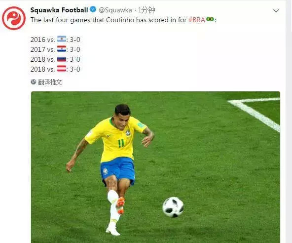 过去四场库蒂尼奥进球的比赛,巴西都取得了3:0的大胜。可惜,没有什么记录是永垂不朽的...