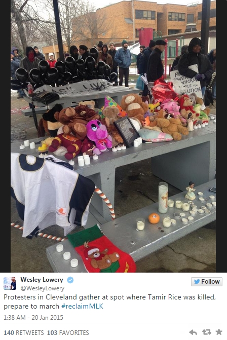 在俄亥俄州的克利夫兰,人们也举行了游行。去年11月,12岁黑人男童Tamir Rice在游乐场玩假枪时被警方击毙。