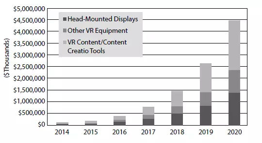 据Tractica发布的预测,在2014年~2020年,VR不管是硬件、内容,以及其他,都将迎来一个高速发展阶段—2020年,用户在VR软件和硬件方面的开支将达到218亿美元。