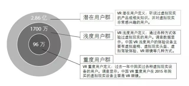 该报告指出,在这 2.86 亿VR潜在用户中,就有1700 万浅度用户在2015 年通过各种方式接触过或者体验过 VR 设备,其中96 万人购买过各种 VR 设备。