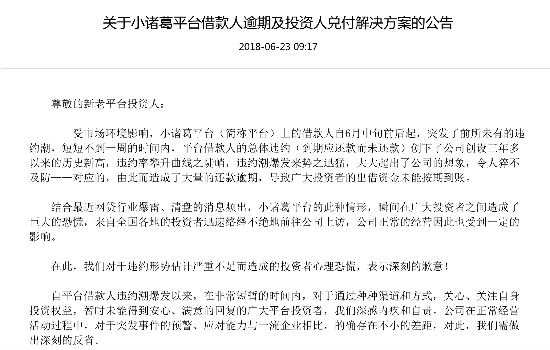 6月23日,小诸葛金服在官网发布《关于全面开启逾期代偿及物权,股权,债权登记确权的公告》。公告表示,从2018年6月起,每个月兑付逾期本金的2%,最晚在两年内兑付完毕,6月逾期款项于6月25日发放。根据小诸葛金服在当日另一份公告中提供的清单,旗下物权,股权,债权等部分的资产价值共计18亿元。