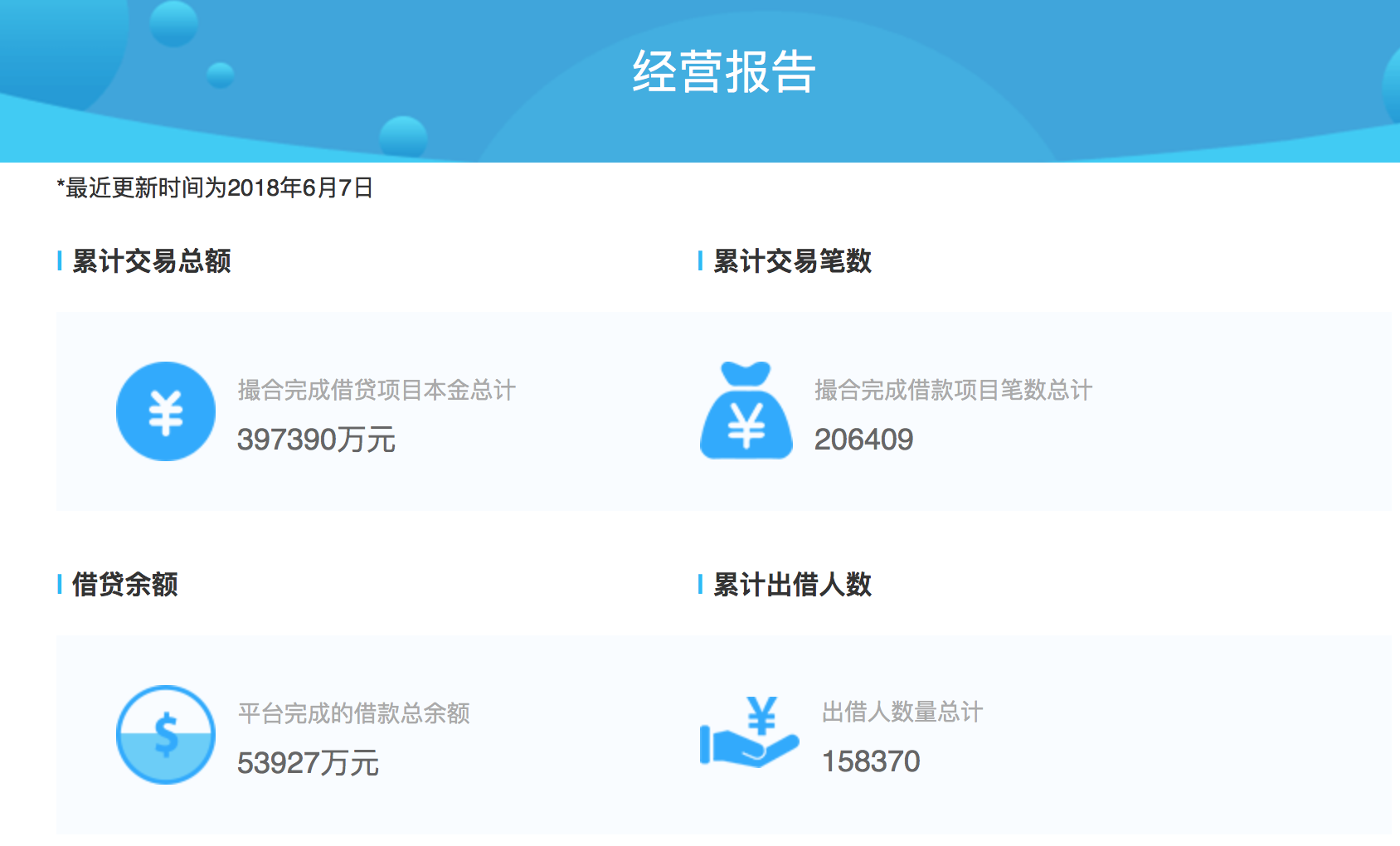 小诸葛金服官网显示,平台在2017年12月上线厦门国际银行的存管,截至6月7日,平台累计交易总额39.7亿元,待还5.3亿元,累计出借人数15.8万。
