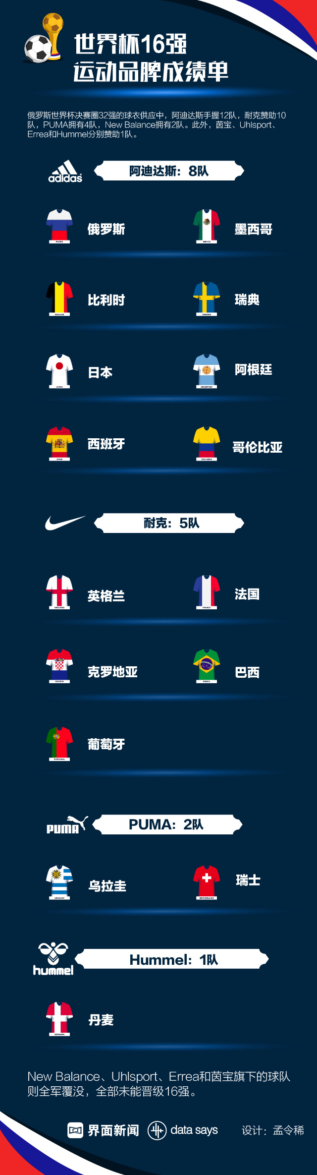 进入淘汰赛的16支队伍中,阿迪达斯旗下拥有8队,虽然折损头牌德国,但依然占据着一半的份额。耐克阵营以5队位居次席,手握英格兰、法国、巴西和葡萄牙等热门国家队。此外,PUMA拥有乌拉圭和瑞士,Hummel“独苗”丹麦依然位居阵中。