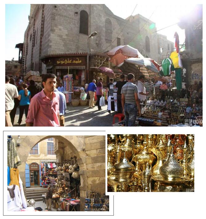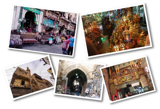 绕过广场边的大楼走进老城区狭窄的街道,拥挤在摩肩接踵的游客中间浏览着各种各样令人目不暇接的手工艺品时,真的好像走进了《天方夜谭》的故事里。集市里有包括铜器、纸草艺术、雕刻、水烟壶、香精、沙画瓶等各色物品,有大概数百家甚至上千家店铺在此营业。绝大多数旅游者都来此购买旅游纪念品,也有开罗市民来此购买日常用品。