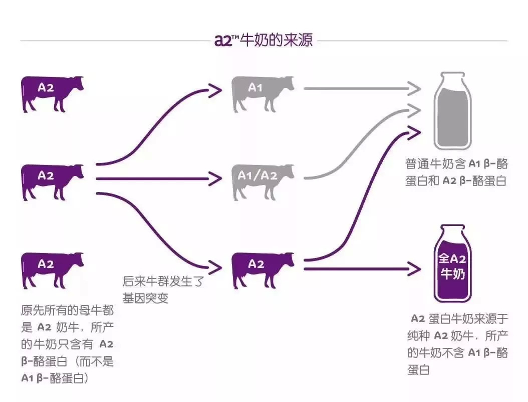 全 A2 蛋白质牛奶,奶源来自于经基因筛选的纯种 A2 奶牛,这些奶牛所产的就是全 A2 蛋白质牛奶,只含 A2 β-酪蛋白,不含 A1 β-酪蛋白。
