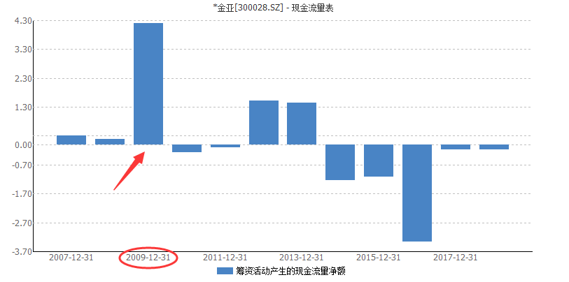 图5:金亚科技2007-2017年度现金流量流量净额柱状图