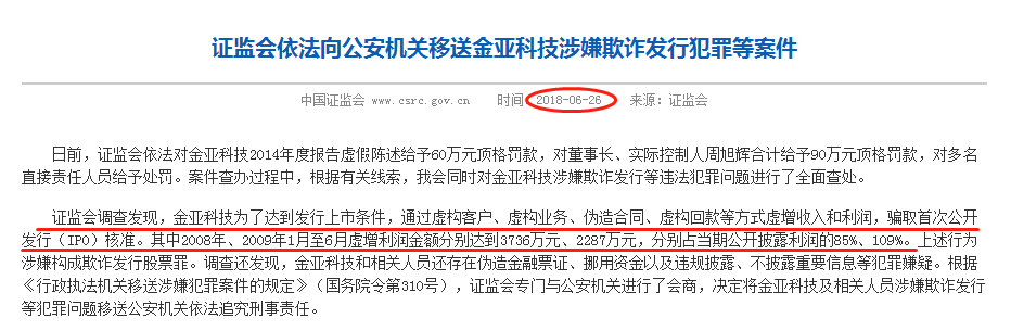 图2:证监会关于金亚科技欺诈发行上市说明的要闻截图