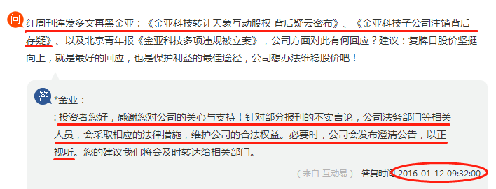 有趣的是,东方财富*金亚吧曾有股民在2016年1月12日向*金亚提问,提到红周刊连发多文(《金亚科技转让天象互动股权 背后疑云密布》----2016年1月5日发表在红周刊官网《金亚科技子公司注销背后存疑》-----2016年1月6日发表在红周刊官网),对金亚科技财务运作提出种种质疑,对于所谓发文 “黑”*金亚的行为问询公司回应。现如今,真相大白,当初的质疑已然成真,当时信誓旦旦的金亚科技,如今因欺诈发行而面临退市,不知道这位提问的股东是否逃离了风险。
