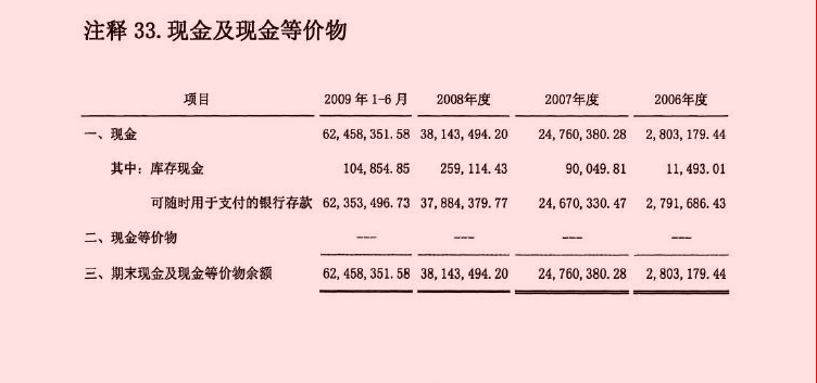 图4:金亚科技报表2006年度-2009年度1-6月现金及现金等价物情况