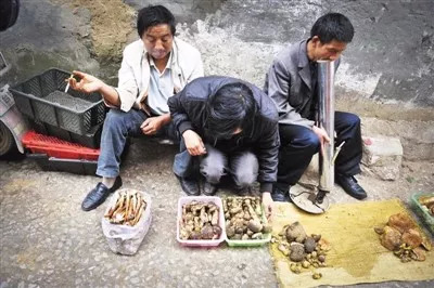 刚采来的菌子拿到曲靖老街的小市场上贩卖。